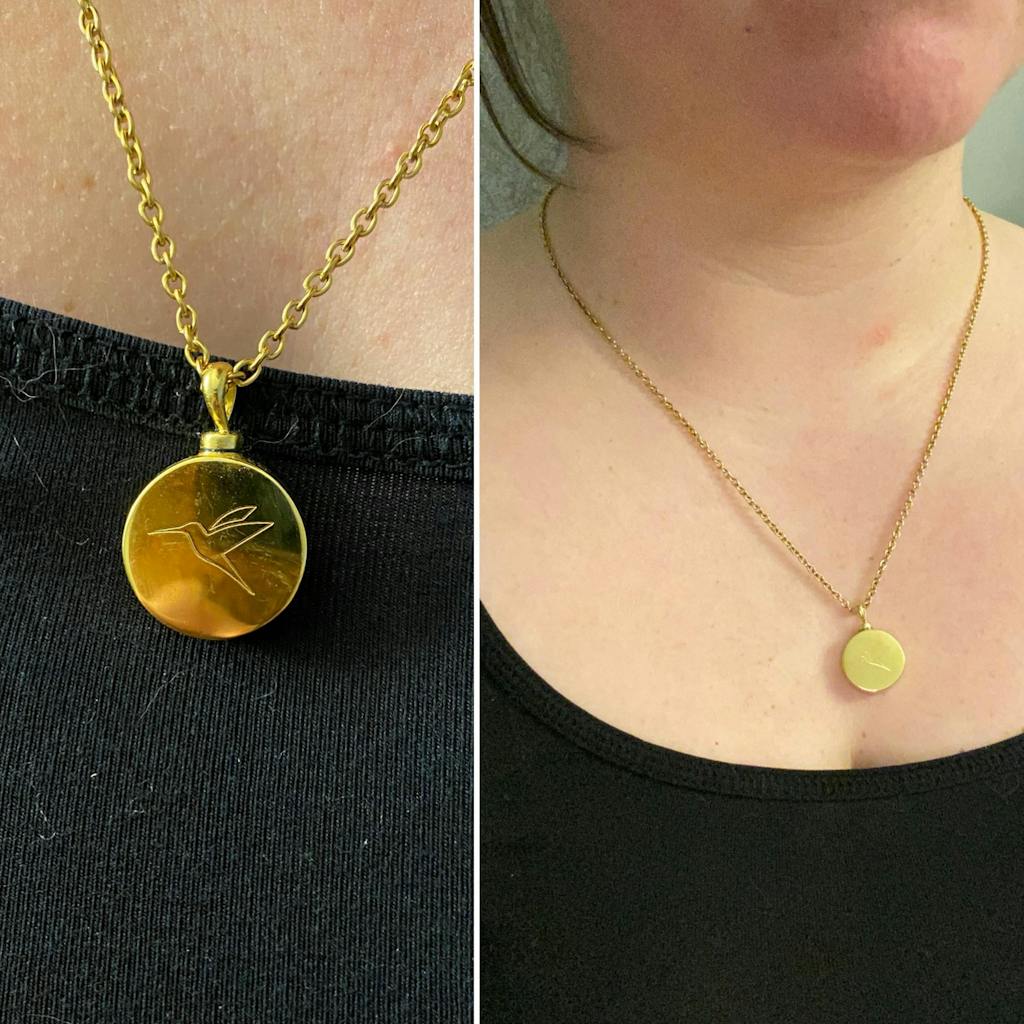 This urn necklace is a great option. I wanted hand writing engraved on one side with the hummingbird on the other and they were able to accommodate 😊