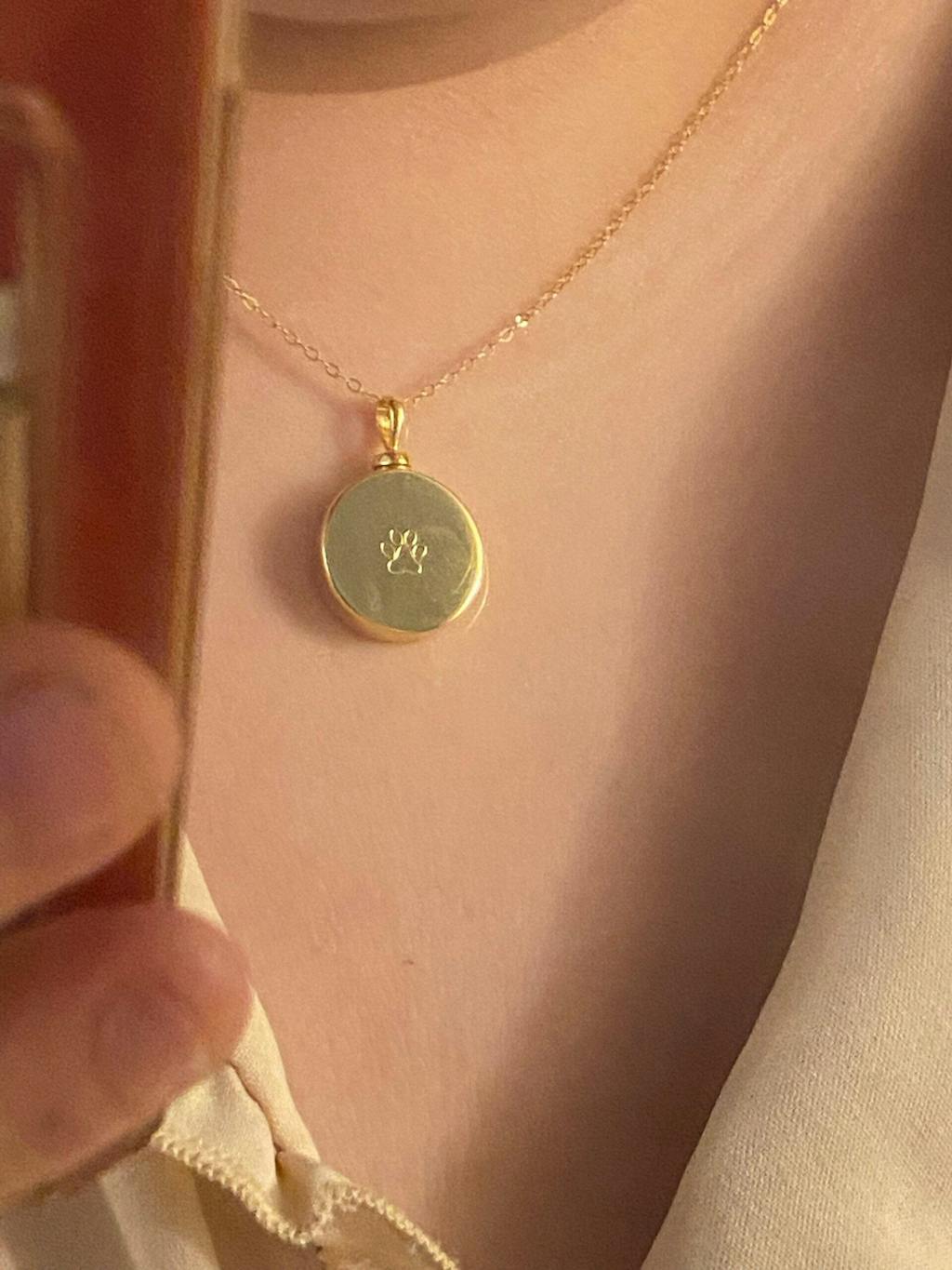 This gold urn necklace is a beautifully crafted 925 sterling silver pendant designed to hold a secret capsule, making it a discreet and meaningful way to keep your loved one's ashes or cherished keepsakes close. The gold sterling silver circle pendant measures 18mm wide and features a screw-top that reveals a hidden cavity perfect for a few drops of perfume, essential oils, grains of sand, or ashes. This custom engraved necklace offers a personal touch with the option to leave the circle blank or add your own engraving, creating an engraved memorial jewelry piece that is truly one of a kind.