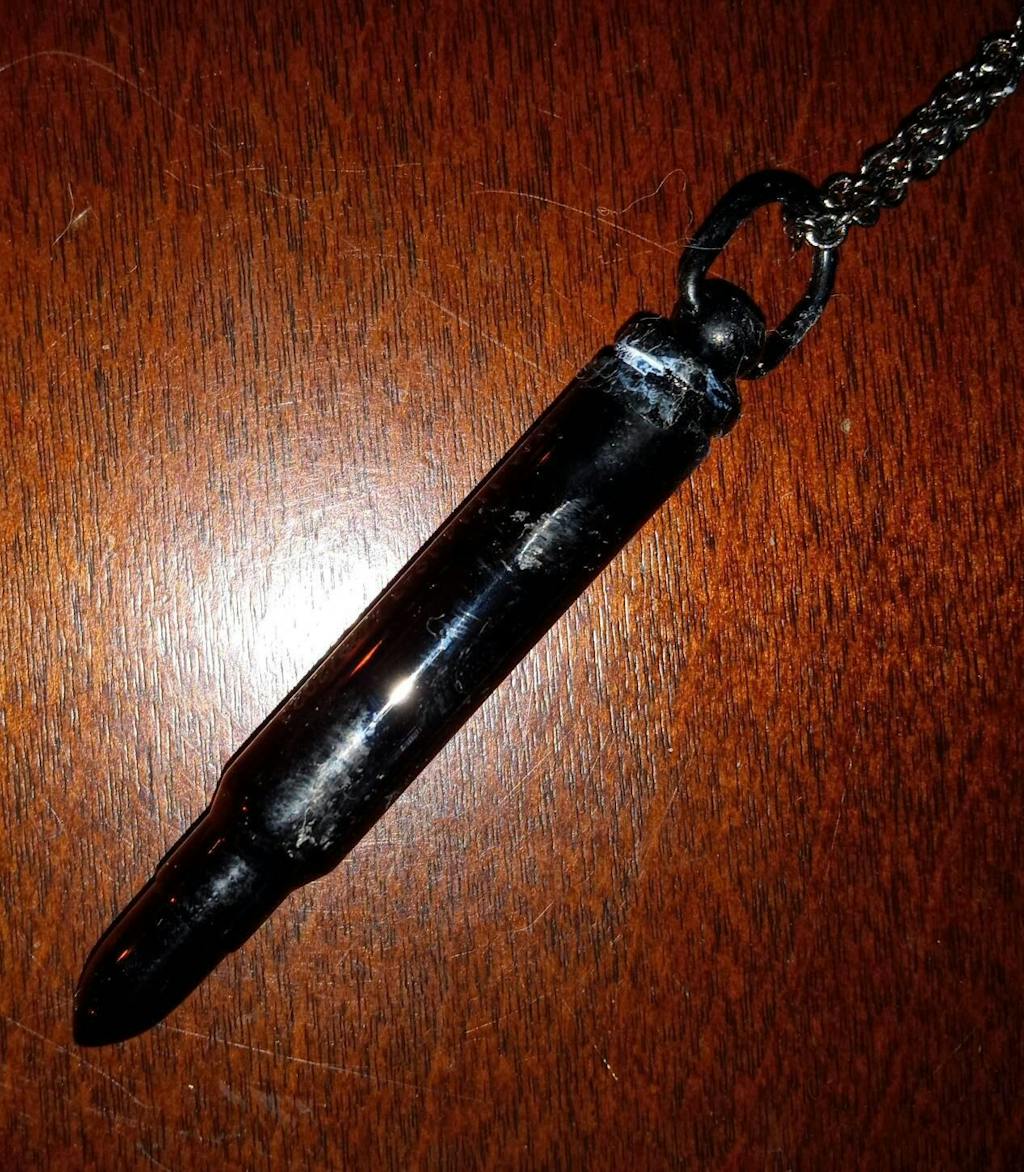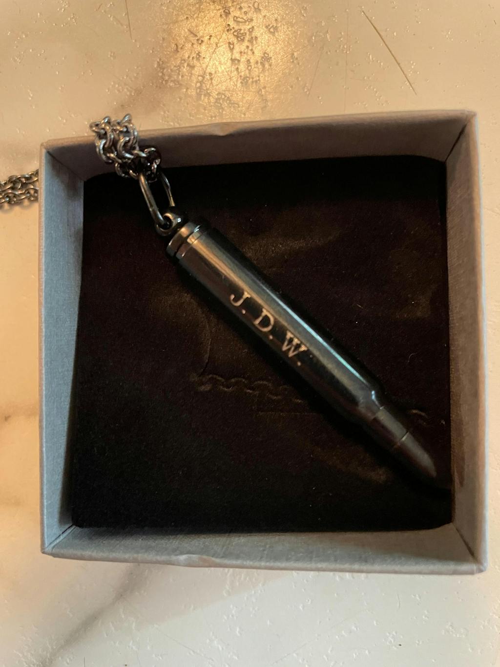 I have hung this dark gunmetal stainless steel rifle bullet capsule on a matching high quality matching gunmetal chain with a lobster clasp. The piece itself measures 2" (5cm) high by 5/16" (8mm) in outside diameter. The inner chamber is 3/16" (3mm) by 1" (25mm) deep.