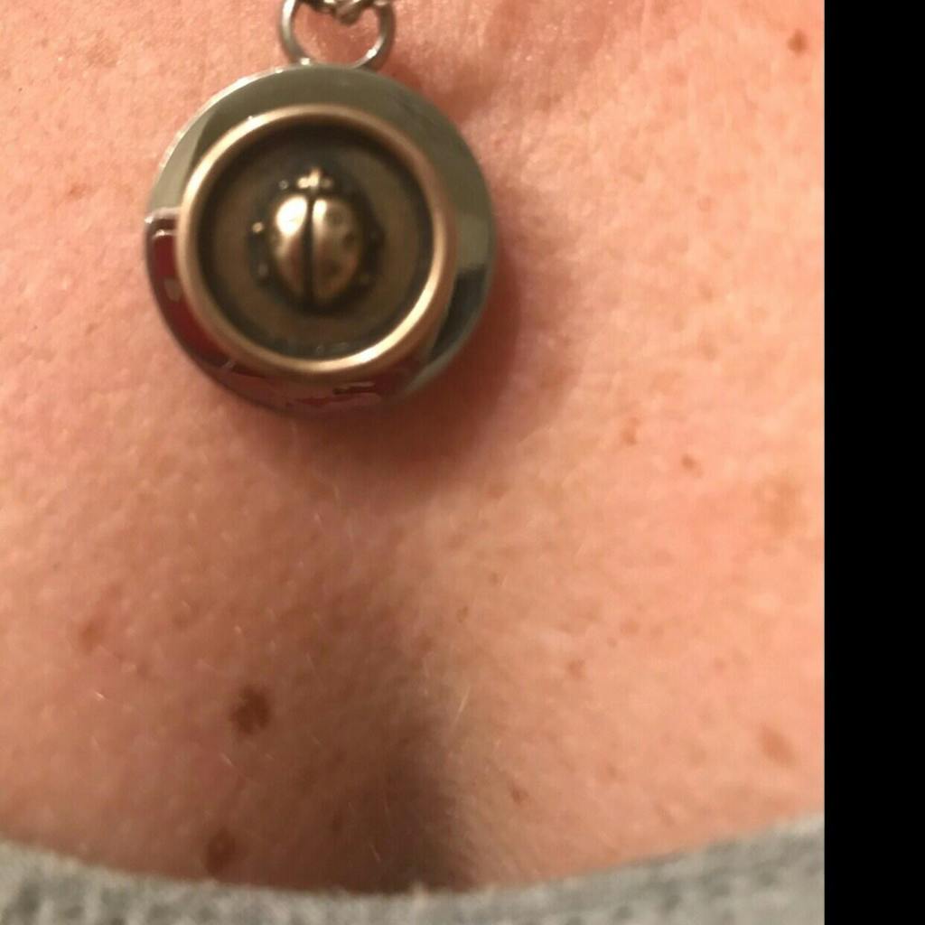 A bronze ladybug on a round stainless steel cremation urn pendant. A subtle and stylish memorial keepsake.