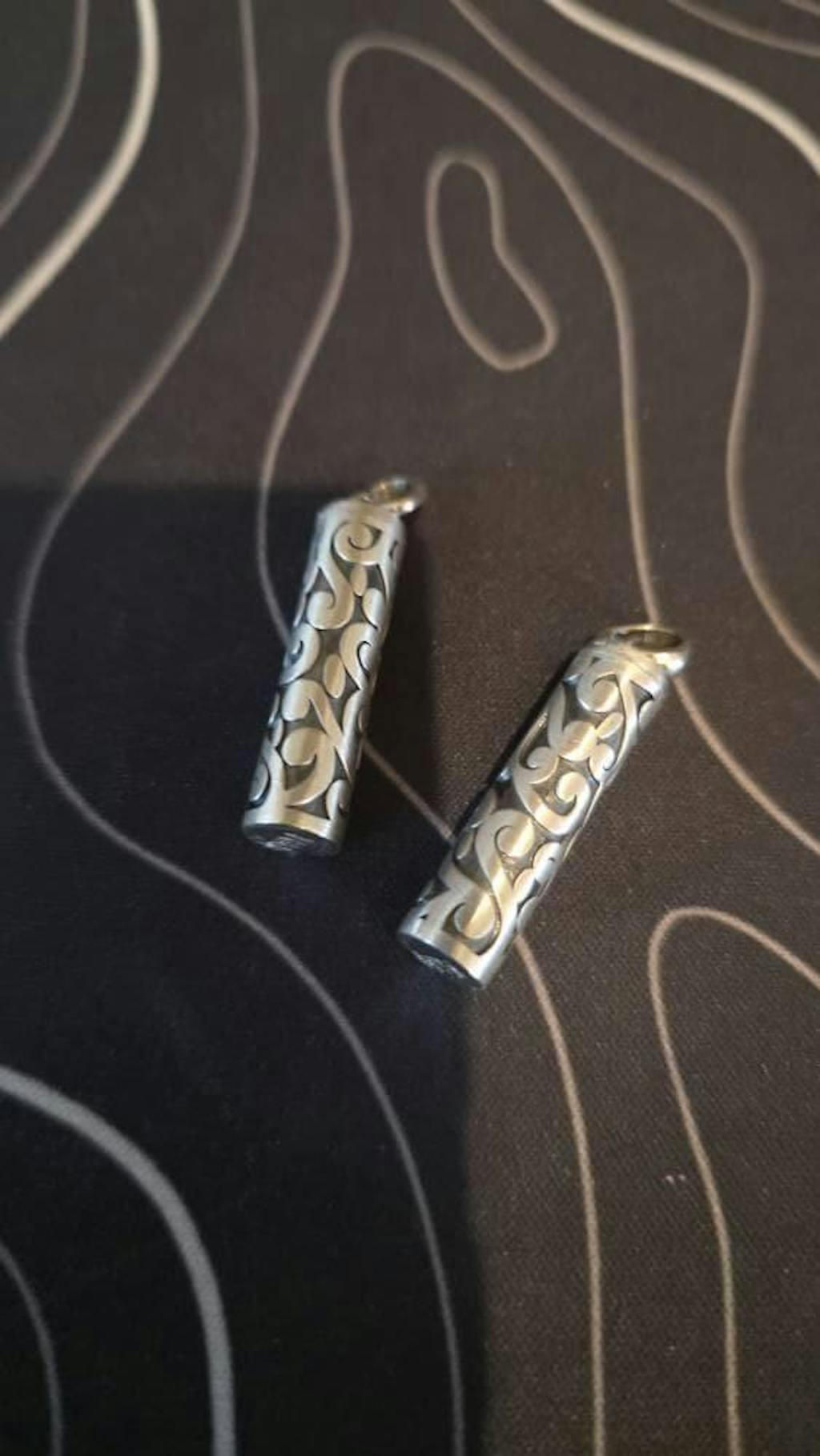 Solid hand cast 925 Sterling Silver cylinder cremation urn necklace with delicate scrolling, a simple and beautiful design.