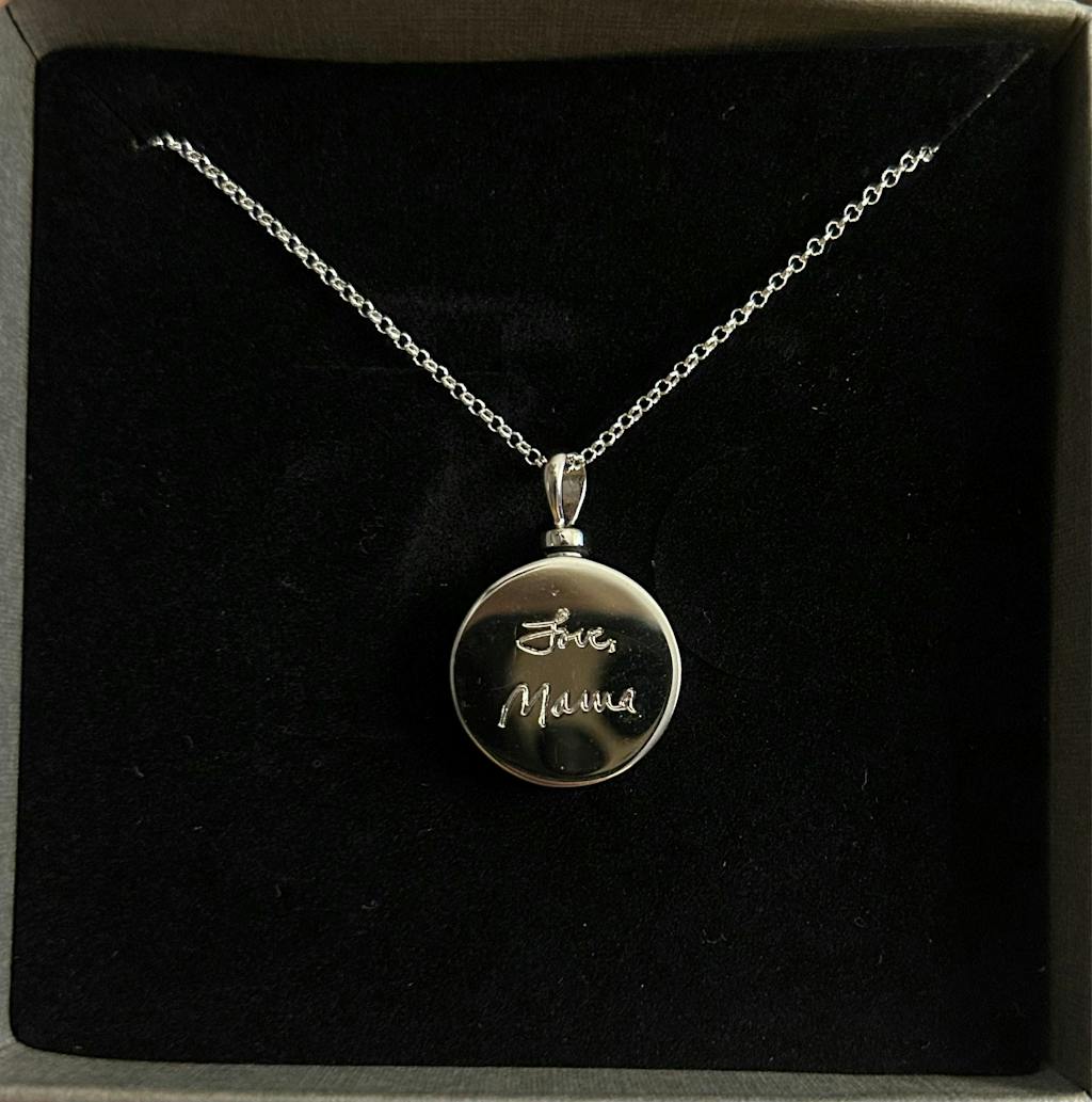 This cremation ashes necklace combines elegant silver memorial pendant styling with the intimate touch of a handwritten message necklace. It makes a thoughtful personalized memorial gift or tribute jewelry gift for anyone honoring a lost loved one. The keepsake ash necklace design ensures your memories remain close to your heart while offering peace and solace.